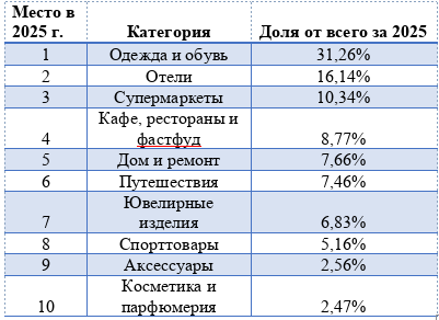 В поездках за границей россияне больше всего тратили на одежду и обувь (31,26% от общего объёма трат за границей), отели (16,14%) и супермаркеты (10,34%). Первые две сохранили свои позиции второй год подряд, тогда как категория «Супермаркеты» поднялась на одну строчку вверх, заменив «Ювелирные изделия».